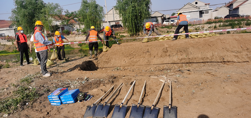 演練模擬了我部施工的污水管道工程靠近河道段由強降雨原因造成河道水位暴漲,即將漫過擋土墻,涌入到開挖的溝槽中的事件。發(fā)現“險”情后,項目部現場施工負責人發(fā)現這一緊急情況立即報告給防汛總指揮,總指揮下達防汛搶險命令。警戒組立即對現場進行清場封閉拉警戒線,物資組將搶險物資第一時間運送到現場。搶險救援組經現場分析得出由于河道下游阻塞造成水位上漲,立即對擋土墻用沙袋加固增高,同時溝槽內進行排水,下游河道采用挖掘機疏通。經過各部門努力河道水位下降險情得到控制,將此消息報告給防汛總指揮,總指揮下達各小組有序撤場命令。
