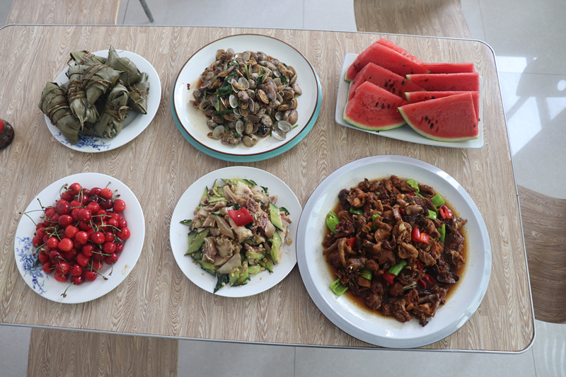 中午11時30分,忙碌了一上午的職工陸續(xù)從工地趕回項目部,辦公室食堂為職工準備了豐富的飯菜,端午節(jié)改善伙食:辣炒花蛤、辣炒雞、豬頭肉拌黃瓜,端午節(jié)少不了的粽子,以及飯后的水果——櫻桃與西瓜。就餐時,同事們歡聲笑語,你一言我一語,品嘗著美食,拉著家常,暫時忘卻了工作的勞累、假期堅守工地不能與家人團聚的思念之情。