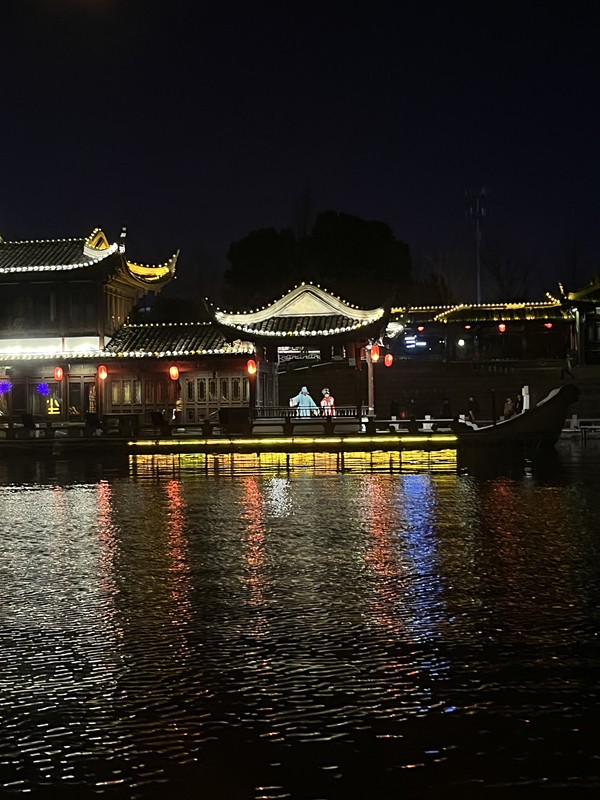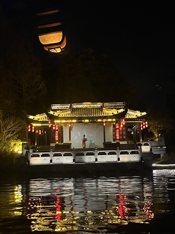 都說泰州是“水天堂、夜游城”,漫步完獨(dú)具風(fēng)情的泰州老街,團(tuán)隊一行夜游鳳城河。鳳城河始鑿于宋寶慶二年,隨著畫舫輕撫波光水色,兩岸美景在霓虹映襯中更顯妖嬈,岸邊戲臺京劇演員翩翩起舞,月下是婆娑樹影、亭臺墨色,與嘈雜喧鬧若即若離,恍若夢境一般。
